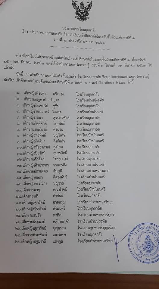 ประกาศผลการสอบคัดเลือกเข้าเรียน ชั้นมัธยมศึกษาปีที่ 1 (รอบที่ 1) เรียงตามลำดับคะแนนจากมากไปน้อย