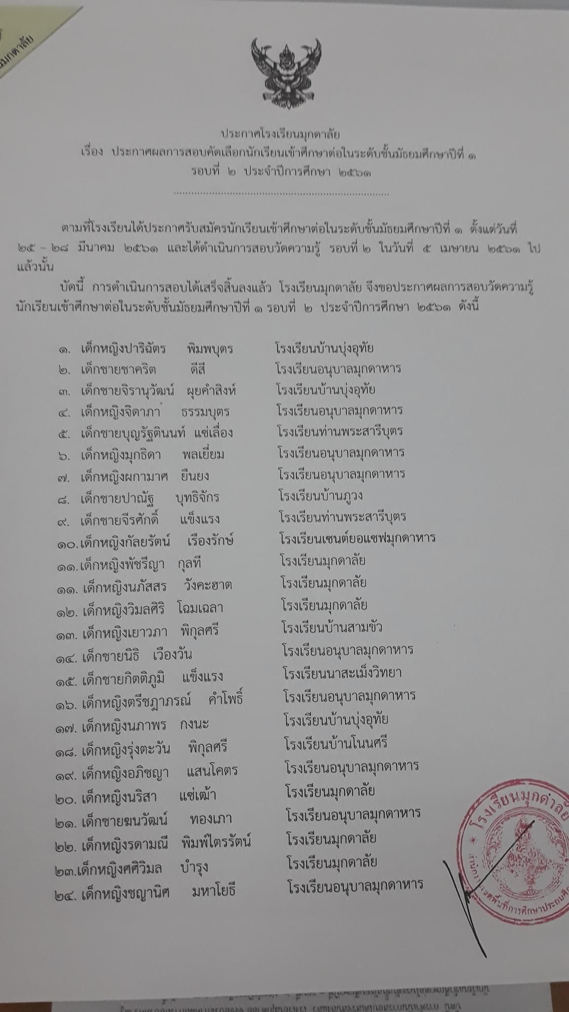 ประกาศผลการสอบคัดเลือก รอบที่ 2 นักเรียนที่สมัครเข้าเรียน โรงเรียนมุกดาลัย ชั้นมัธยมศึกษาปีที่ 1 ปีการศึกษา 2561 เรียงตามลำดับคะแนนจากมากไปน้อย