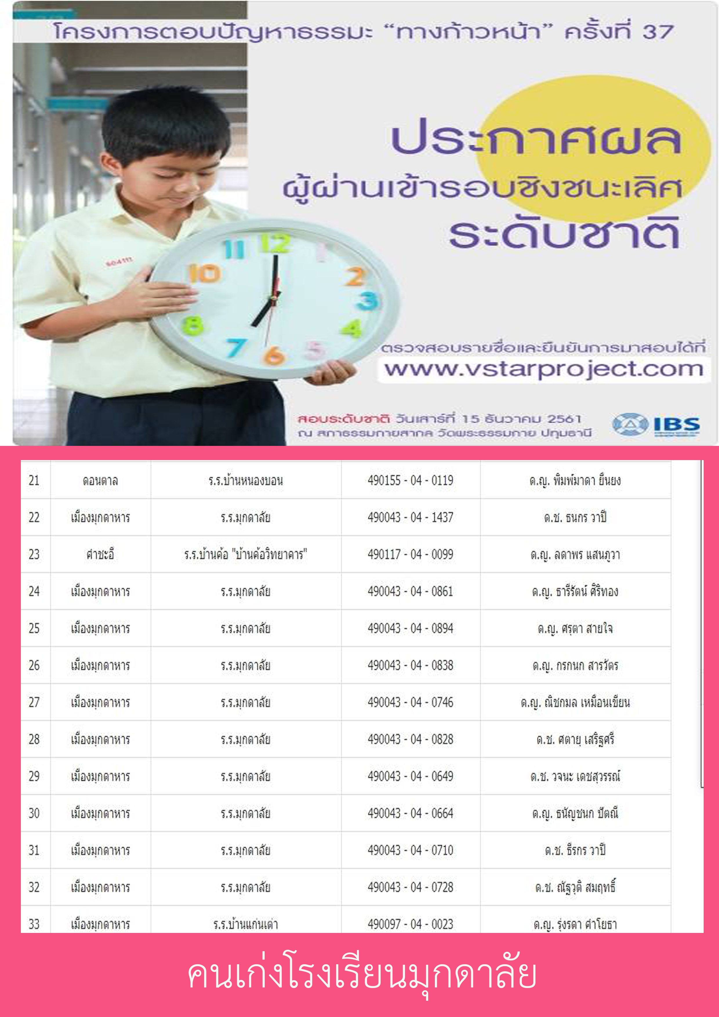 ขอแสดงความยินดีกับนักเรียนในระดับ ป.5-ป.6 จำนวน 10 คน ที่มีรายชื่อผู้มีสิทธิ์สอบรอบชิงชนะเลิศ ระดับชาติ ตามโครงการตอบปัญหาธรรมะ