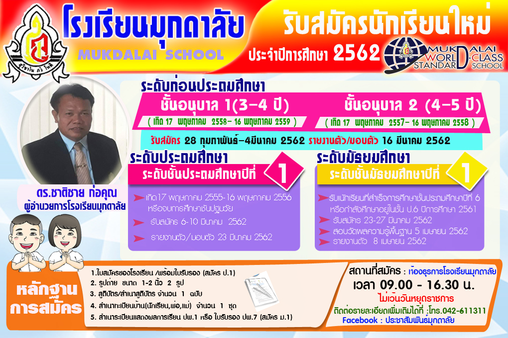 โรงเรียนมุกดาลัย เปิดรับสมัครนักเรียนใหม่ ชั้นอนุบาล 1 ประถมศึกษาปีที่ 1 และมัธยมศึกษาปีที่ 1 ประจำปีการศึกษา 2562