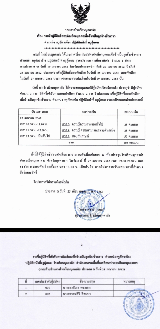 ประกาศรายชื่อผู้มีสิทธิ์สอบคัดเลือก ครูอัตราจ้าง