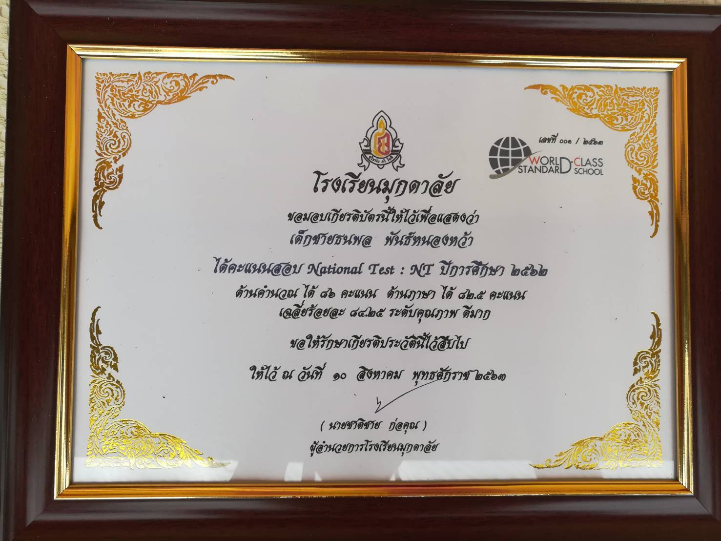 วันที่ 10 สิงหาคม 2563 ดร.ชาติชาย ก่อคุณ ผู้อำนวยการโรงเรียนมุกดาลัย มอบเกียรติบัตรให้กับนักเรียนที่ได้คะแนนสอบ National Test:NT ในระดับคุณภาพ ดีมาก ปีการศึกษา 2562